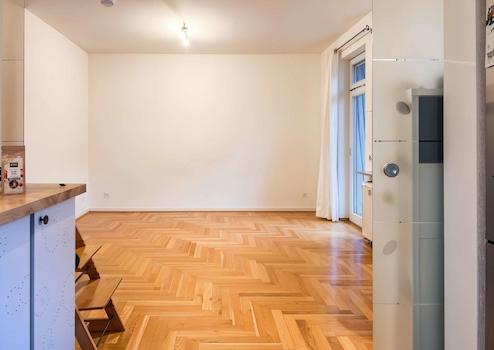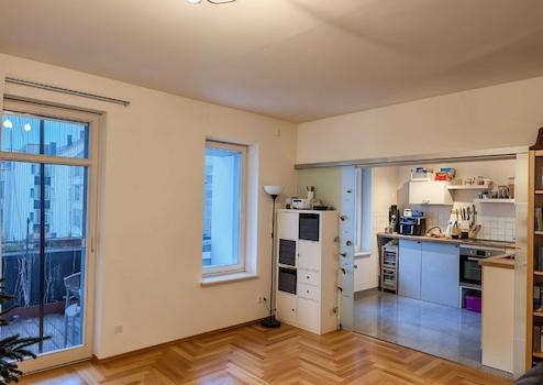 Linkerhand gelangen Sie in das großzügige Wohnzimmer mit Zugang zur Küche. Die Küche lässt sich durch eine verglaste Schiebetür praktisch vom Wohnbereich trennen. Vom Wohnzimmer aus haben Sie Zugang auf den Balkon mit Blick in den Innenhof.