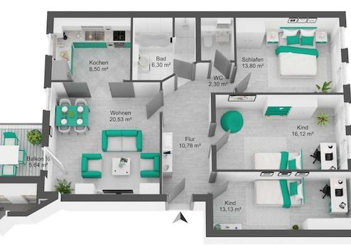 Hinweis: Zum Schutz der Privatsphäre der aktuellen Mieterin wurden manche Räumlichkeiten digital geleert oder mit Einrichtungsbeispielen versehen.
