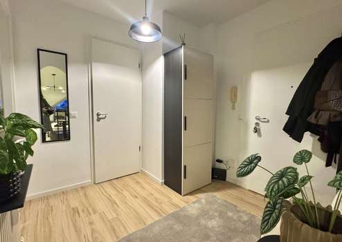Nach dem Betreten der Wohnung empfängt Sie ein freundlicher Flurbereich, von dem aus links das Tageslichtbad mit Badewanne und Dusche erreichbar ist. Direkt daneben liegt das ruhig gelegene Schlafzimmer, das sich ideal als Rückzugsort eignet.