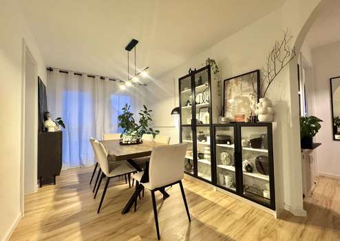 Der großzügige Wohn- und Essbereich bildet das Herzstück der Wohnung. Die offene Gestaltung mit der angrenzenden Küche schafft ein einladendes Ambiente, perfekt für gemeinsame Mahlzeiten und erholsame Abende. Die vorhandene Einbauküche kann bei Interesse von der aktuellen Mieterin gegen einen Aufpreis übernommen werden, wodurch ein sofortiger Einzug erleichtert wird. Ein Kellerabteil bietet zusätzlichen Stauraum und rundet das Angebot ab.