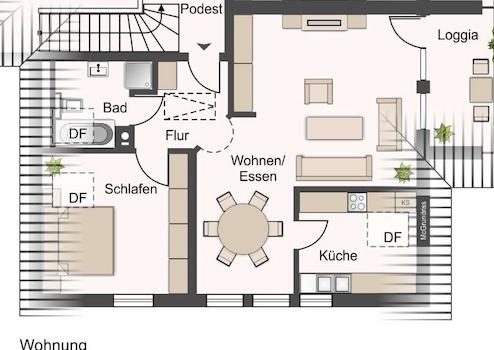 Im obersten Stockwerk eines gepflegten Mehrfamilienhauses mit lediglich sechs Wohneinheiten befindet sich diese ansprechende 2-Zimmer-Wohnung. Auf rund 65 m² überzeugt sie durch einen praktischen Grundriss, helle Räume und einen gemütlichen Balkon, der zu entspannten Stunden im Freien einlädt.