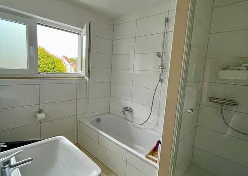 Das Tageslichtbad verfügt über eine Badewanne sowie eine Dusche. Zusätzlich steht ein separates WC zur Verfügung. Ein Kellerabteil bietet praktischen Stauraum, und im Haus befindet sich ein Gemeinschaftsraum für Waschmaschine und Trockner.
