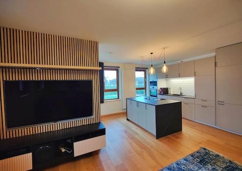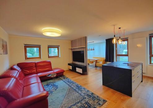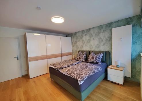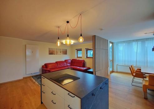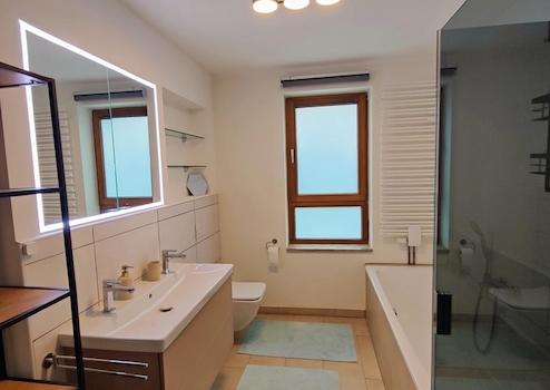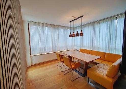 Um die gehobene Ausstattung abzurunden, wurde bei der Modernisierung eine Multimedia-Trennwand eingezogen, welche den Wohn- und Essbereich räumlich voneinander abgrenzt. Des weiteren sind alle Rolläden und Verdunkelungsvorhänge per Fernbedienung oder auch Sprachassistenten und die Heizkörper mit smarten Thermostaten bedienbar.