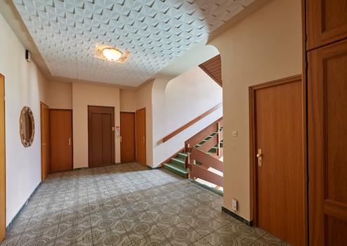 Über einen verglasten und daher hellen Verbindungsbau erreichen Sie das Nebengebäude mit ca. 223 m². In diesem Verbindungsbau befand sich der Empfangs- und Bürobereich des Kurhotels.