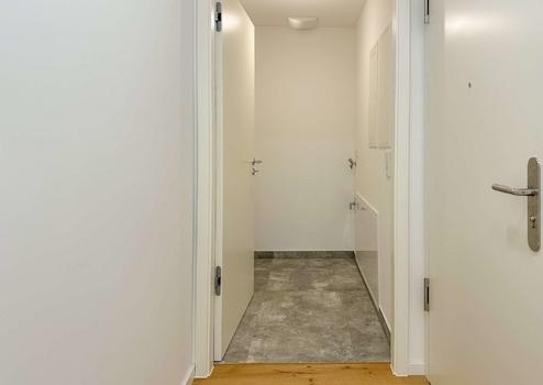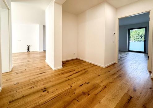 Der geräumige Eingangsbereich bietet ausreichend Platz für eine Garderobe. Der freundliche Empfang führt Sie in das Herzstück der Wohnung: das eindrucksvolle Wohnzimmer mit offener Küche, einem Loggia- sowie einem Zugang auf die ca. 28 m² große Terrasse im grünen Gartenanteil.