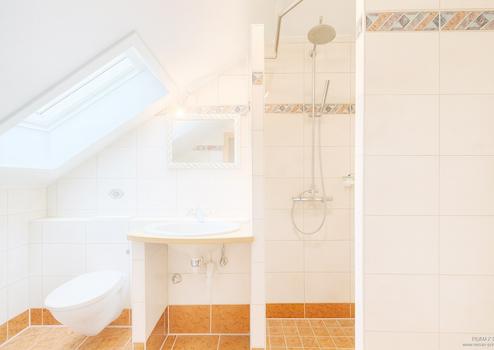 - modernes Tageslicht-Duschbad mit WC, Waschbecken und Waschmaschinenanschluss