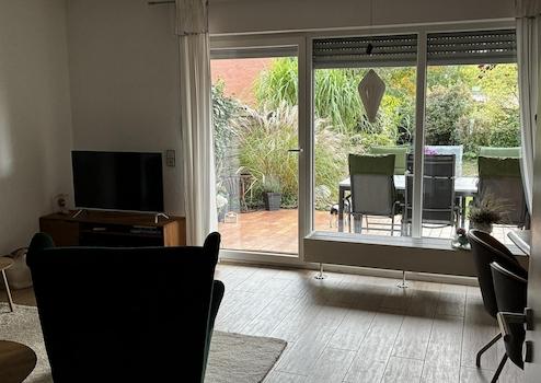 Erdgeschoss: heller Flur mit Zugang zur neuwertigen, modernen Küche, zum Gäste-WC und dem Einbau-Schrank. Von dort geht es in das großzügige und helle Wohnzimmer mit direkten Zugang zur Süd-Terrasse und Garten.