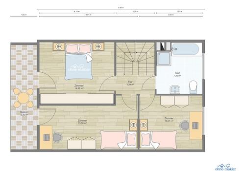 Obergeschoss: Flur mit Zugang zum Bad mit Dusche/Wanne, sowie den 3 hellen Kinderzimmern. 2 Kinderzimmer verfügen dabei über einen direkten Zugang zum Balkon.