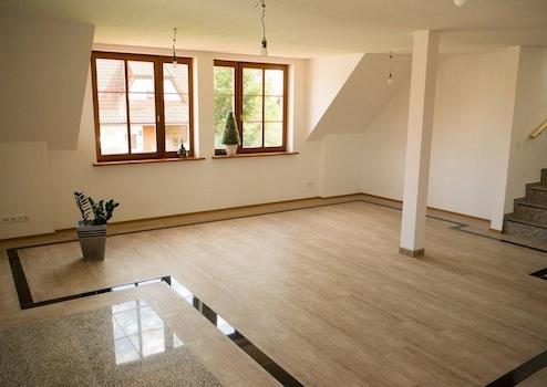 Zur Maisonette-Wohnung im Obergeschoss gehört im DG-Studio ein schöner Balkon, welcher zum Süden hin ausgerichtet ist. Ebenfalls ist bei der Maisonette-Wohnung eine große Garage mit ca. 20 m² und darunter liegendem Kellerraum im Mietpreis enthalten.