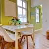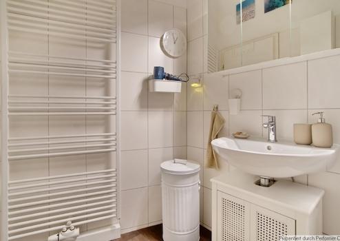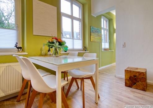 The parking space in the rear courtyard is for your sole use, solving the problem of finding a parking space in such a central location. Also provided are two TVs, Vodafone GigaTV, HomeNet and wi-fi internet access. The bedroom is furnished with an extremely spacious wardrobe and a double bed (1.60m x 2.00m) and a second TV set with the Waipu streaming service. Access to the south-east-facing balcony from the kitchen, which is equipped with a dishwasher, ceramic hob, oven, microwave, fully automatic coffee machine (De Longhi), toaster and kettle. A good selection of tableware, pots and pans, baking utensils, glasses and towels is also provided. A basic selection of bedlinen, a hairdryer, iron and ironing board and last but not least a washing machine on the ground floor all ensure you have a perfect stay.