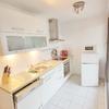 der offen geschnittene Wohn-Essbereich mit voll ausgestatteter Einbauküche verfügt über eine gemütliche Couch, Fernseher, einen kleinen Esstisch.