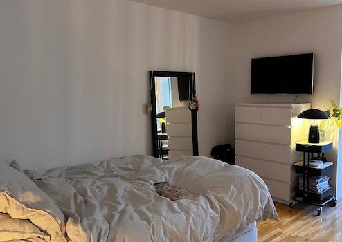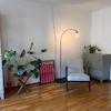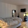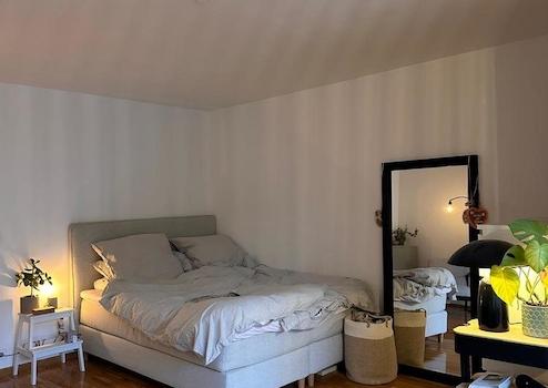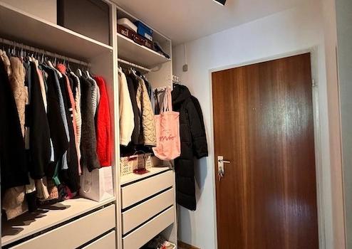 Großzügig geschnittenes 1-Zimmer-Apartment. Heller Wohn-/Schlafraum mit Doppelbett, Essbereich und Lounge Chair. Schöner Balkon. Separate, kleine Küche. Badezimmer mit Waschmaschine und Badewanne. Großer Kleiderschrank im Eingangsbereich.