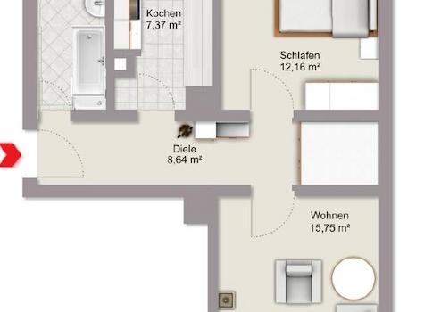 Im Schlafzimmer haben Sie ca. 12 qm zur Verfügung. Ein großer Kleiderschrank kann bequem aufgestellt werden. 1 großes Fenster sorgt für ausreichend Helligkeit.