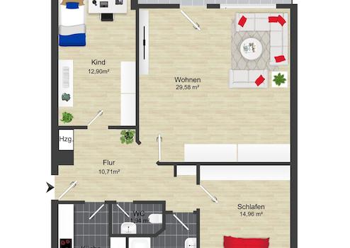 Die Wohnung verfügt über eine separate Küche, ein Tageslichtbad mit Dusche sowie einen großzügigen Wohn- und Essbereich mit Zugang zum Balkon. Ein Schlafzimmer sowie ein weiteres flexibel nutzbares Zimmer – ideal als Arbeits-, Kinder- oder Gästezimmer – runden das Raumangebot ab und sprechen eine breite Mieterzielgruppe an.