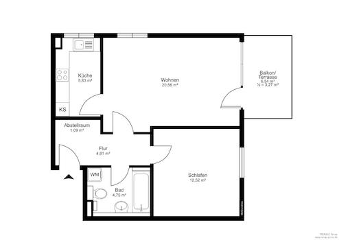 Die separate Küche verfügt über ein Fenster, das Schlafzimmer bietet einen gelungenen Schnitt und viel Ruhe. Das gepflegte Badezimmer ist mit einer Badewanne und einem Waschmaschinenanschluss ausgestattet. Eine praktische Abstellecke im Flur schafft zusätzlichen Stauraum und rundet das Gesamtbild ab.