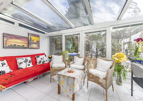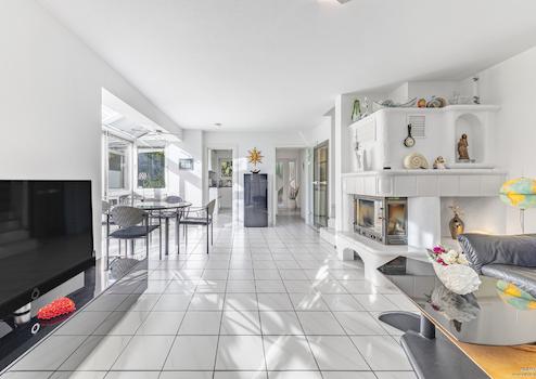 Ein besonderes Highlight ist der verglaste Terasse, die den Wohnbereich harmonisch mit dem Garten verbindet. Er verfügt ebenfalls über eine Fußbodenheizung sowie eine elektrische Markise als Sonnenschutz. Der Wohnbereich selbst wird durch einen Kamin mit Kassetteneinsatz aufgewertet – ideal für gemütliche Stunden in den kälteren Monaten.