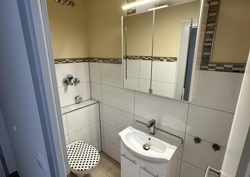 Beim Betreten der Wohnung finden Sie auf der linken Seite das neuwertige WC und auf der rechten Seite die neu verbauten Einbauschränke nebst der Garderobe und einen kleinen Abstellraum, in dem Sie platzsparend Ihre Sachen unterbringen können.