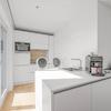 Einbauküche mit Gerätschaften wie Kühlschrank, Spülmaschine und Back-/Mikroofen;