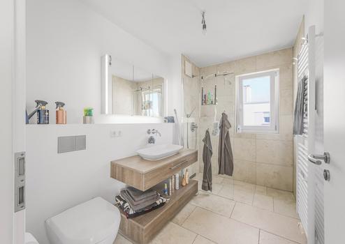 Badezimmer mit bodentiefer großer Dusche, Handtuchheizkörper und Fenster;