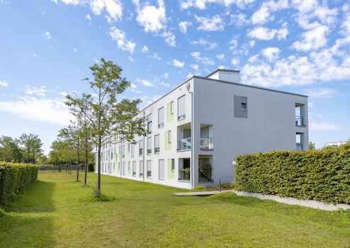 München, Stadtviertel Messestadt Riem, Flughafen-Riem-Str. 61, Mehrfamilienhaus mit 2 Obergeschossen; es ist das letzte Haus der Häuserreihe, direkt gelegen am Landschaftspark Riem, dort wo 2005 die Bundesgartenschau war.