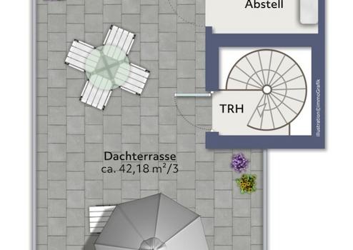 Reiner Wohnraum ca. 57,07 m² plus Dachterrasse von ca. 42,18 m²;