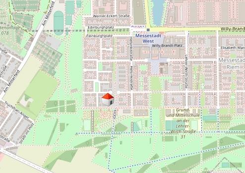 Der Willy-Brandt-Platz liegt direkt daneben – mit U-Bahn-Zugang (Messestadt West), Brunnen, kulturellen Einrichtungen und als zentraler Treffpunkt des Viertels.