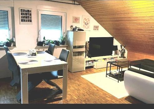 Die sehr ruhige DG Wohnung umfasst zwei lichtdurchflutete Zimmer .Der sehr freundliche offene Eingangsbereich führt direkt in das Wohn- und Esszimmer mit angrenzender Küche..