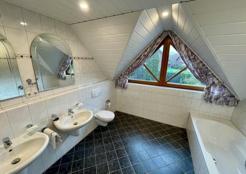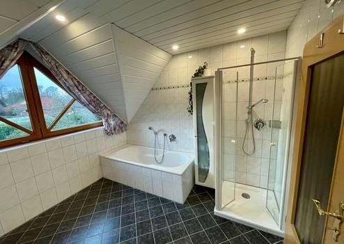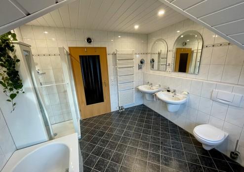 - Badezimmer mit Dusche und Badewanne sowie Doppelwaschbecken und WC