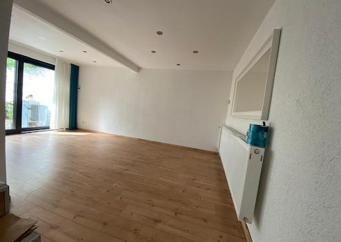 Gartengeschoss: Großzügiges Wohnzimmer mit direktem Zugang zum sonnigen Süd-Garten, separate Küche und praktischer Abstellraum.