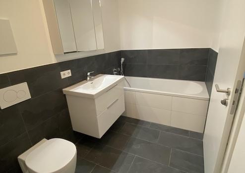 - Helles Badezimmer mit Feinsteinzeugfliesen inkl. Badewanne und bodenebener Dusche mit Echtglas Duschwand