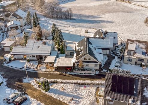 Direkt hinter dem Haus beginnen weitläufige Felder, Wälder und Wanderwege, die zu Spaziergängen, Sport oder Erholung einladen. Die Landschaft bietet zu jeder Jahreszeit ein beeindruckendes Panorama und eine außergewöhnliche Wohnqualität.