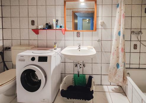 Das Bad verfügt über einen Waschmaschinenanschluss und eine Duschwanne mir Vorhang.