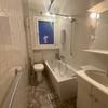 -das Badezimmer ist mit einem Fenster und Badewanne ausgestattet und ist voll verfliest