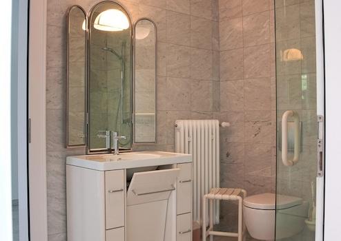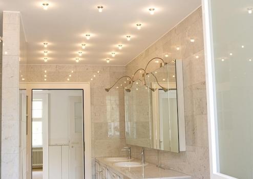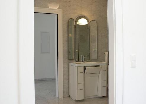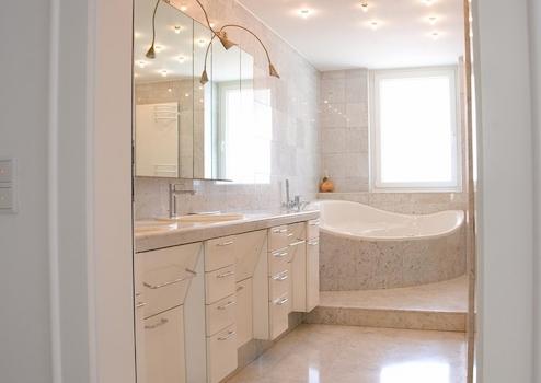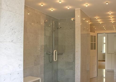 - Große Eck-Badewanne und bodengleiche Dusche im Hauptbad