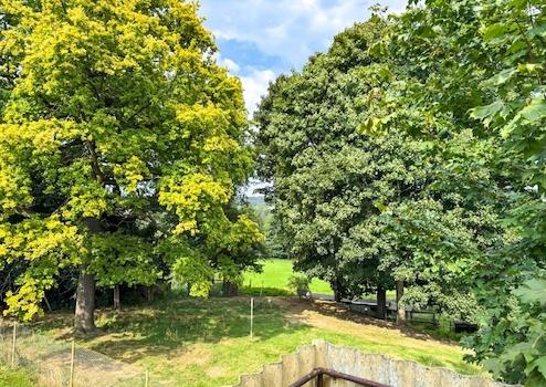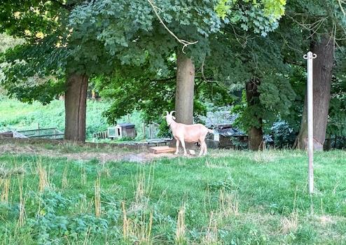 Das besonders Schöne Ihrer Wohnung im Erdgeschoss des Hauptgebäudes ist die große Terrasse auf der ruhigen Gartenseite mit Blick ins Grüne - und auf die Ziegen des Nachbarn.