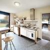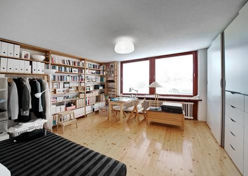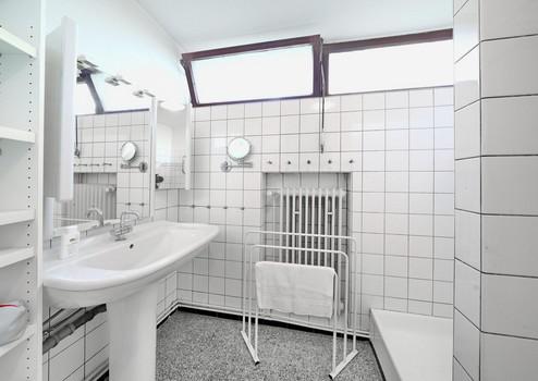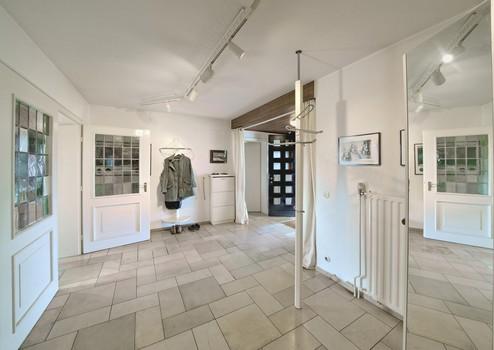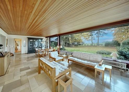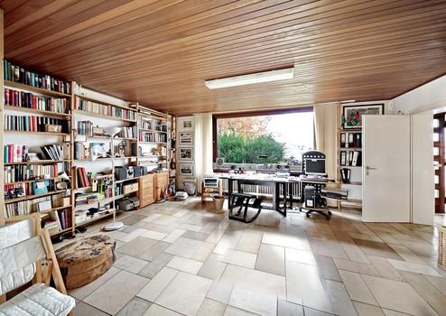 Kaminofen, hochwertige Sollnhofer Platten in Wohnzimer, Flur und Arbeitszimmer, Parkett in Schlafzimmern