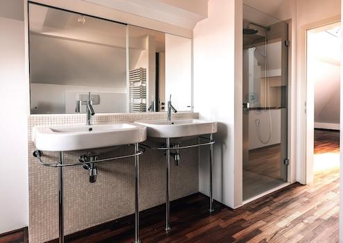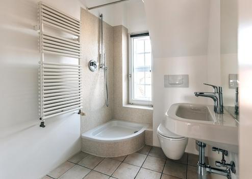Die Wohnung verfügt über zwei voll ausgestattete Bäder. Im oberen Masterbereich befindet sich ein luxuriöses Bad mit großer Eckbadwanne sowie einer separaten Dusche.