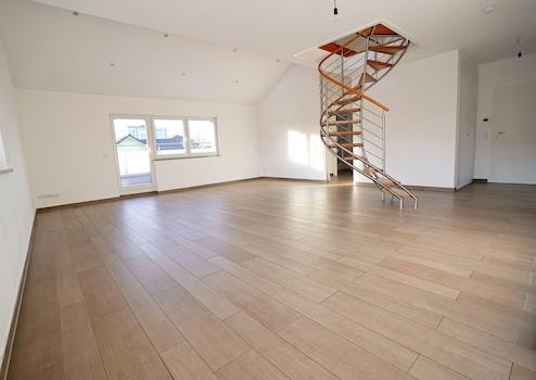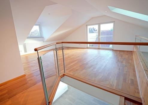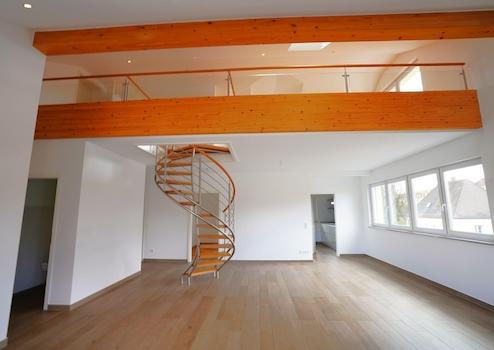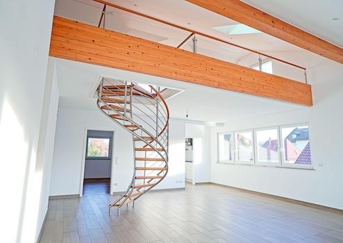 Ein echter Hingucker ist die Designer Spindeltreppe und die Galerie mit dem Glasgeländer. Dank der zahlreichen Fenster sie licht- und sonnendurchluftet und bietet sich als private Relaxoase an, ergänzend zum großzügigen Wohnzimmer. Durch den zweiten Zugang übers Treppenhaus kann das weitere Zimmer auf der Galerie optimal auch für Gäste nutzt werden.