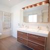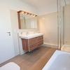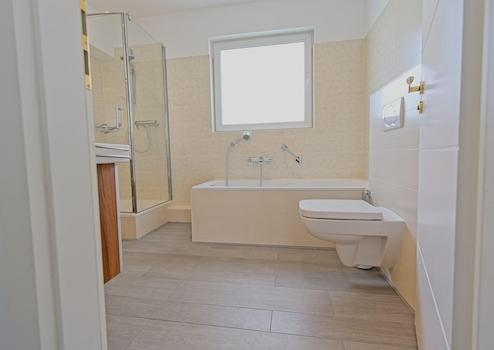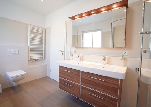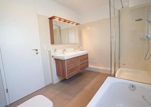 Das Tageslichtbad verfügt über ein großes Fenster, eine Fußbodenheizung und einen Handtuchheizkörper, eine Badewanne, eine Dusche mit Glastrennwand, ein WC und eine Doppelwaschbecken. Es ist mit cremefarbenen Fliesen und exklusiven Spiegel- und Waschtischunterschränken in Nussbaum ausgestattet.