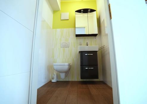 Das Gäste WC hat hochwertige Designerfliesen, ein Waschbecken, ein WC und einen anthrazit farbenen Spiegel- und Waschtischunterschrank.