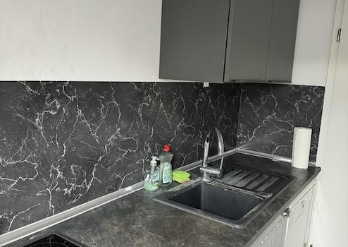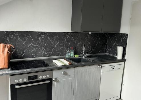 Die vorhandene Einbauküche und Badmöbel können für 490 € übernommen werden