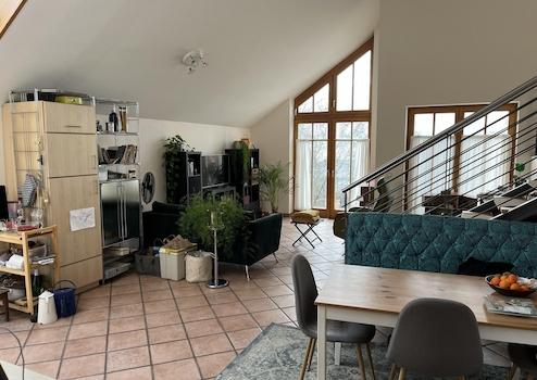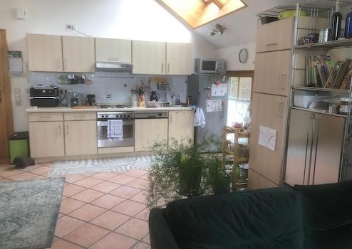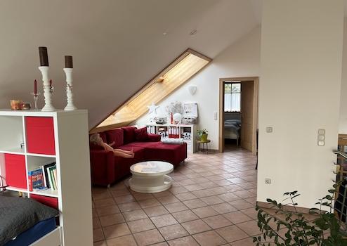 Wir vermieten eine wunderschöne, lichtdurchflutete Dachgeschosswohnung in moderner Split-Level-Bauweise. Sie überzeugt mit einer Einbauküche, einem eigenen Balkon (bei schönem Wetter Blick in die Alpen) und einem großzügigen Wohnbereich, der sich über zwei Ebenen erstreckt. Darüber hinaus gibt es ein Schlafzimmer mit ca. 13 m², eine Abstellkammer, in die auch eine Waschmaschine passt, sowie einen kleinen Dachboden.
