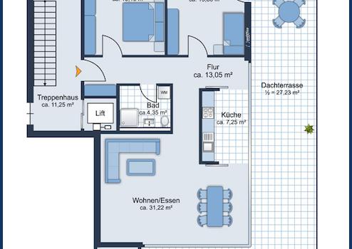 Ein echtes Highlight ist die großzügige Dachterrasse mit Südost-Ausrichtung, die viel Platz für ein entspanntes Frühstück oder gesellige Grillabende bietet. Praktisch: ein Abstellraum mit ca. 4 m² direkt auf der Terrasse sowie ein weiterer Kellerraum mit ca. 10 m² schaffen reichlich Stauraum.