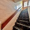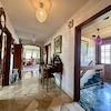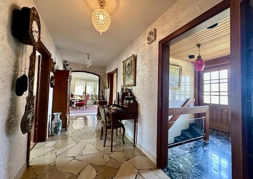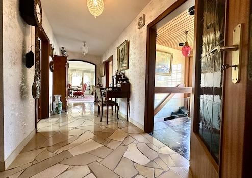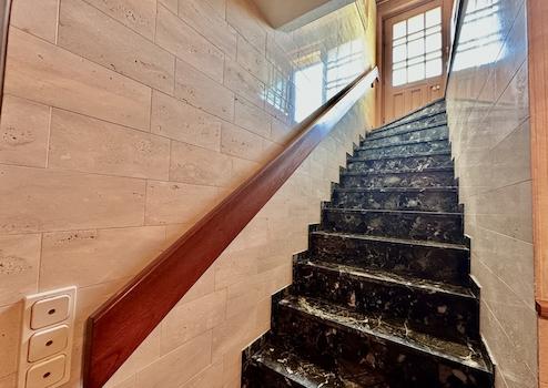 Vom Eingangsbereich führt eine mit Marmor belegte Treppe in das Souterrain und eine verglaste Tür in die Wohnräume des Erdgeschosses.