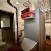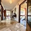 Der Eingangsbereich ist mit grünem Marmor und hellem Travertin ausgelegt, hier befinden sich auch das Gäste-WC und eine Garderobe.