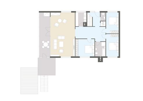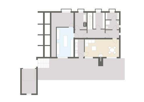 Das Erdgeschoss umfasst zwei Schlafzimmer, ein Arbeitszimmer, ein Tageslichtbad, eine Küche und einen großes Wohnzimmer mit anschließendem Wintergarten bzw. Loggia.