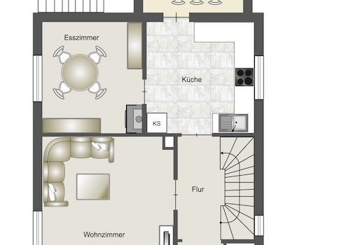 Die Wohnfläche von ca. 100 m² verteilt sich auf EG und DG. Im EG befinden sich das Wohnzimmer, das separate Esszimmer, die Küche, ein WC sowie die Küchenveranda mit Zugang in den rückwärtigen Hof.