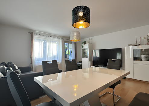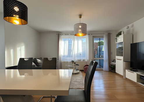 Der Wohn- und Essbereich ist lichtdurchflutet und bietet ausreichend Platz für eine gemütliche Sofalandschaft sowie einen Essplatz. Von hier aus gelangen Sie direkt auf die Terrasse und in den eigenen Gartenbereich – ideal, um die Sonne zu genießen oder den Tag entspannt ausklingen zu lassen.