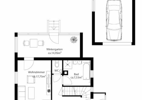 Im Erdgeschoss befindet sich der großzügige Wohnbereich, der aktuell in zwei Räume unterteilt wurde und somit neben dem Wohnzimmer auch Platz für ein zusätzliches Arbeits- oder Schlafzimmer bietet. Ergänzt wird das Erdgeschoss durch die separate Küche, ein Tageslichtbad sowie ein Gäste-WC. Der helle Wintergarten, der das Haus harmonisch mit dem Garten verbindet, lädt ganzjährig zum Entspannen ein.