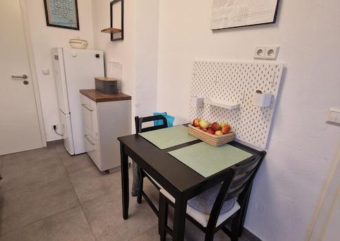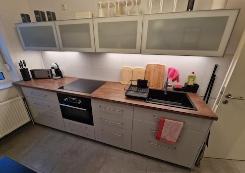 Die im Jahr 2021 installierte IKEA-Einbauküche ist mit einem Induktionskochfeld, einem Backofen mit Mikrowellenfunktion sowie einem Kühlschrank ausgestattet. Darüber hinaus können die auf den Fotos ersichtlichen Sitzmöbel sowie eine Candy-Smart-Waschmaschine mit 6 kg Fassungsvermögen übernommen werden. Der derzeitige Mieter stellt sich für das Gesamtpaket einen Abschlagsbetrag in Höhe von 3.000 € vor.